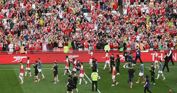 Skuad Arsenal melakukan lapangan di Emirates Stadium setelah kemenangan pada hari terakhir musim melawan Everton. Kemenangan itu membuat peluang mereka untuk meraih gelar Premier League tetap hidup namun Manchester City mengalahkan West Ham untuk meraih gelar keempat berturut-turut.
